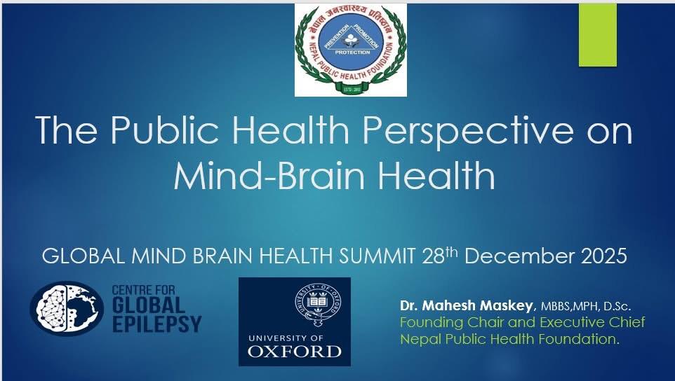 Our Founding Chair and Executive Chief, Dr. Mahesh Kumar Maskey, was recently invited to the inaugural Global Mind–Brain Health Summit held at Corpus Christi College, University of Oxford, hosted by the Centre for Global Epilepsy. He delivered a presentation on the public health perspective of mind–brain health and also served as a panelist for the session Driving Sustainable Change: Securing the Future of Global Mind–Brain Health. The event was inaugurated by Lord William Hague, Chancellor of the University of Oxford.
