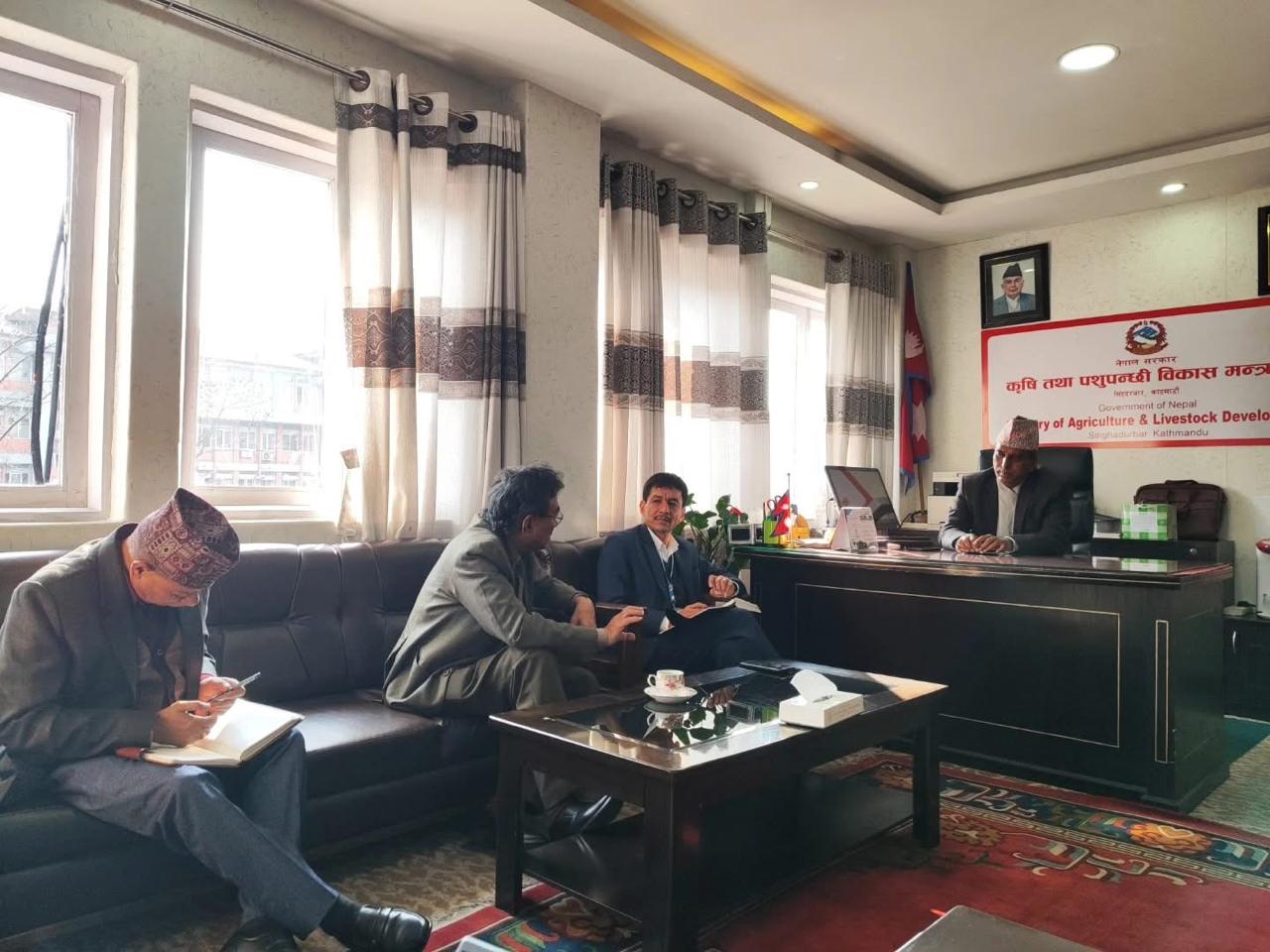 The team from Nepal Public Health Foundation engaged in a meeting with officials from the Ministry of Agriculture and Livestock Development, including Dr.Rajendra Prasad Mishra, secretary and Dr. Ram Krishna Shrestha, assisant secretary.